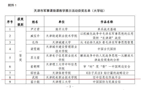 我校武剛老師的作品《空中信息化作戰平臺》,結合微課程特點,充分利用信息化手段,精心設計教學環節,經專家評審,在天津市軍事課微課教學展示活動(大學組)中榮獲天津市一等獎。