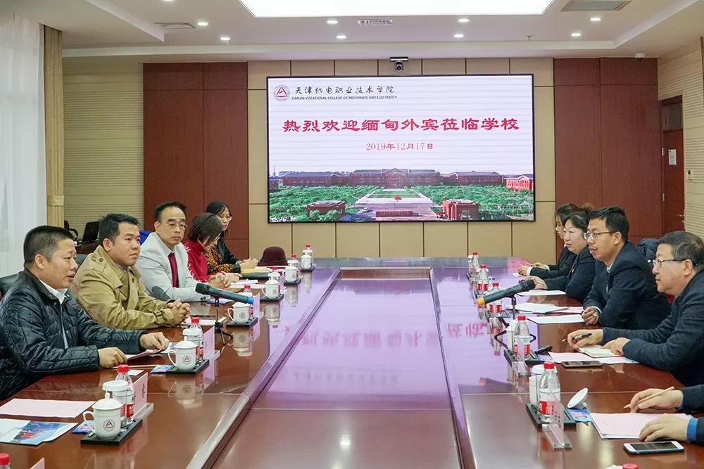 參觀結束后,雙方在圖文515會議室進行了會談,校長張維津為緬方外賓介紹了學校概況以及全國職業院校技能大賽、魯班工坊建設等情況。緬甸客人表示,通過對學校各實訓室的參觀,他們能夠深切的感受到中國技術的發展,中國職業教育的先進。緬中友好協會主席林勇先生提到,2014年李克強總理訪問緬甸,并提出為緬甸200個高中畢業生提供去中國學習和培訓的機會。2018年,這200個學生學成回緬,成為了緬甸各大企業高薪競聘的重要人才。通過此事,緬甸人民意識到了中國技術技能在世界上的影響力,深刻了解到技能培訓對緬甸發展的重要性。緬中友好協會主席一行,希望通過此次的訪問,能夠加強中緬兩國之間的交流,深化兩國的聯系,共同發展中緬兩國的職業技能培訓。