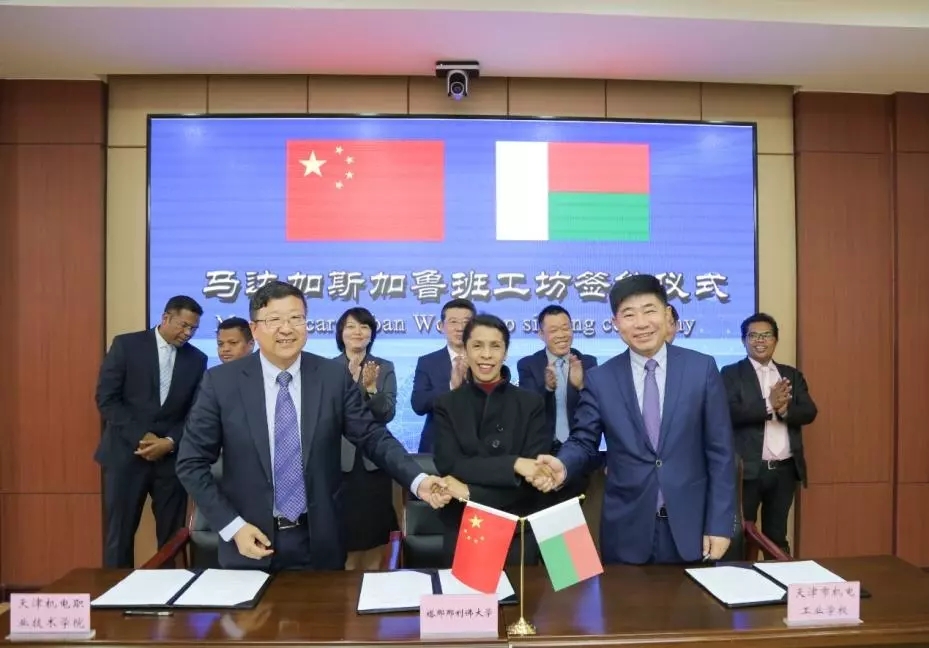 10月19日,在天津市教委白海力副主任的見證下,天津市機電工業學校、天津機電職業技術學院、塔那那利佛大學、中鐵十八局集團有限公司,就馬達加斯加魯班工坊建設合作事宜分別簽署了三方《中馬魯班工坊建設合作協議書》和四方《合作備忘錄》。