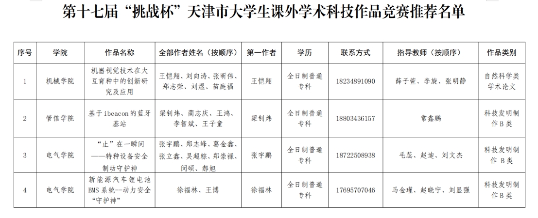 按照《關于組織開展第十七屆“挑戰杯”天津市大學生課外學術科技作品競賽的通知》和《關于第十七屆“挑戰杯”天津市大學生課外學術科技作品競賽作品申報工作的通知》要求,學校推薦件作品,參加第十七屆“挑戰杯”天津市大學生課外學術科技作品競賽。現將推薦名單予以公示。