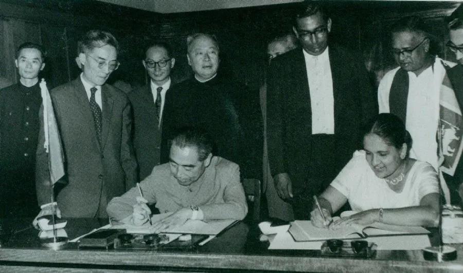 1964年2月26日至29日,周恩來訪問錫蘭(今斯里蘭卡)時,和總理西麗馬沃·班達拉奈克夫人簽署中錫聯合公報。